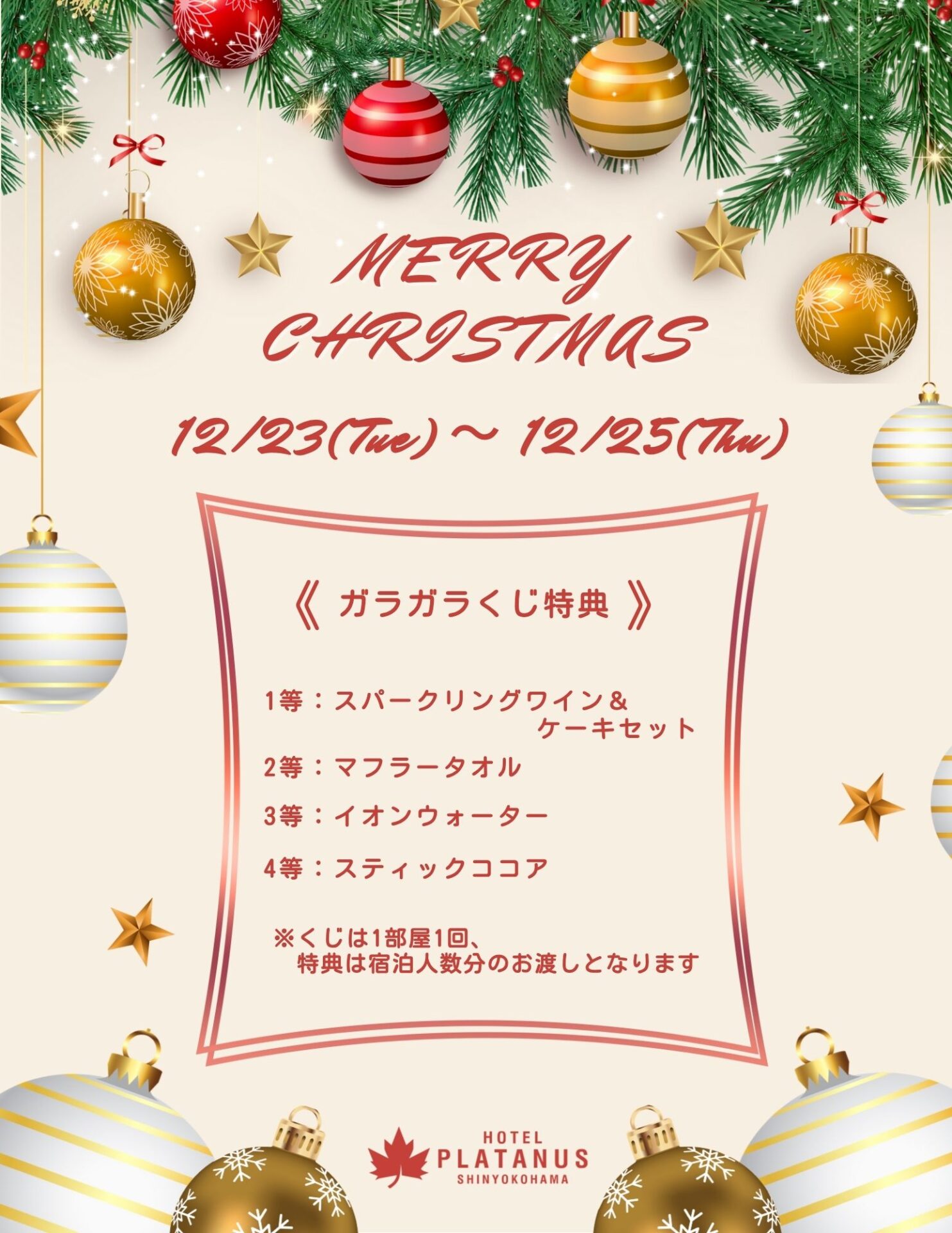 クリスマスキャンペーン🎄🌟 12/23~12/25にご宿泊いただいたお客様は、 ガラガラくじにご参加いただけます! 1等は 『スパークリングワイン&ケーキセット』 クリスマスはホテルプラタナス...
